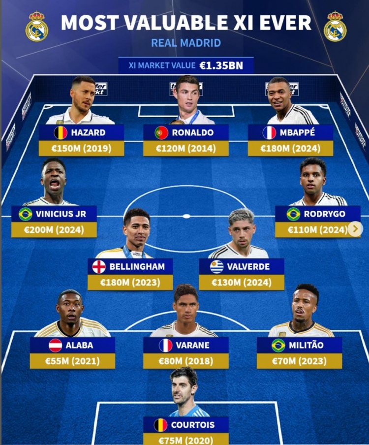 前鋒:阿紮爾(2019,1.5億)、C羅(2014,1.2億)、姆巴佩(2024,1.8億)
